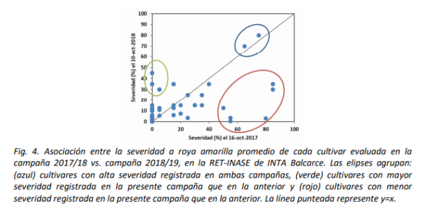 Al comparar la severidad registrada en la presente campaña con la registrada en similar fecha de la campaña anterior (Fig. 4) se encontró una baja asociación. Hubo cultivares con baja o alta severidad temprana coincidente en ambas campañas, pero también hubo cultivares con mayor severidad en esta campaña que en la anterior y con menor severidad en esta campaña que en la anterior. Esta falta de coincidencia entre años obliga a realizar el seguimiento de cada lote para poder decidir el control químico y su momento de aplicación apropiado.