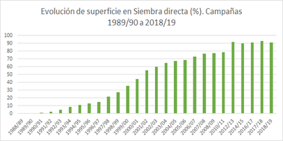 Figura 1: Evolución de la superficie en SD (hectáreas). Campañas 1989/90 a 2018/19. (Fte.: Bolsa de Cereales /Aapresid)