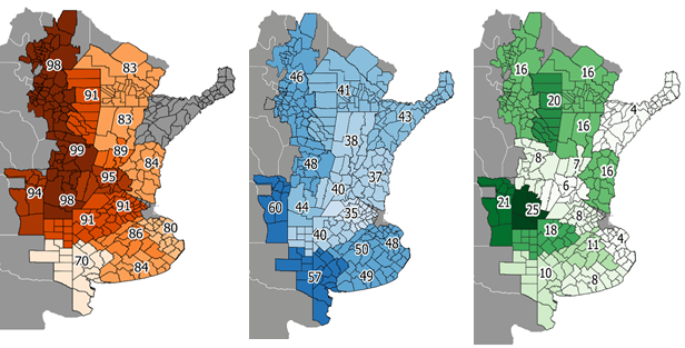 Figura 4: Mapas por zonas agroecológicas para la campaña 2018/19 de: a) % de adopción de siembra directa (Fte: Bolsa de Cereales/Aapresid); b) % de gramíneas en la rotación; y c) % de productores que realizan cultivos de cobertura o servicios (Fte: Bolsa de Cereales).