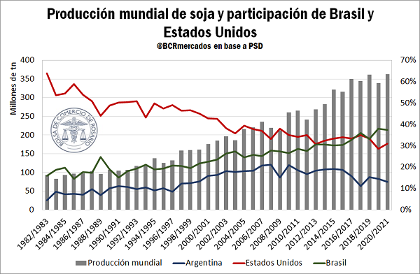 En la campaña 1981/82, Brasil apareció como el tercer mayor productor mundial, similar posición en la que se encuentra hoy día. Sin embargo, su producción pasó de casi 23 Mt hace casi 39 años atrás, a 109 Mt para el ciclo 2020/21 y su participación evolucionó del 6% al 10% de la producción mundial. Argentina, pudo duplicar su participación en este período (de un 2% a un 4% entre las campañas citadas), mientras que su producción paso de 9,5 Mt a 47 Mt estimadas para el actual ciclo comercial.