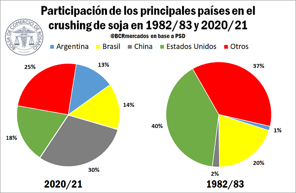 En lo que refiere a la industrialización de la soja, la situación también ha evidenciado un profundo cambio en los últimos 39 años. En 1982 se procesaron a nivel global 76 Mt, de las cuales el 40% se procesaron en Estados Unidos, el 20% en Brasil, el 2% en China y apenas el 1% en Argentina. En la actualidad, se proyecta que se industrialicen 322 Mt de granos a nivel mundial en la corriente campaña, lo que indicaría un aumento del 324% en cuatro décadas, la mayor parte de la cual será procesada en China (30%), seguido de Estados Unidos (18%), Brasil (14%) y Argentina (13%).