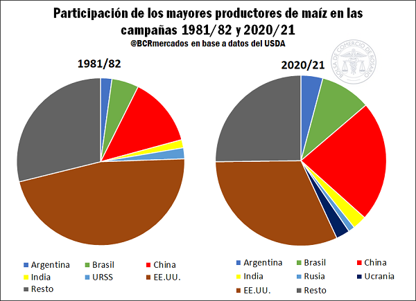 Los mayores productores de maíz a nivel internacional en mayo de 1982 (campaña 1981/82) eran Estados Unidos y China; lo cual se mantiene en la actualidad. No obstante, las participaciones sobre la producción mundial de ambas naciones han variado, principalmente la del país norteamericano, la cual pasó de representar el 47% del maíz mundial (206 millones de toneladas) en dicha campaña, al 32% (360 millones de toneladas) en el ciclo 2020/21, una caída en 15 puntos porcentuales. En sentido contrario, China pasó de producir el 15% del maíz mundial al inicio del período (59 millones de toneladas) a alcanzar una participación del 23% sobre el total (261 millones de toneladas).