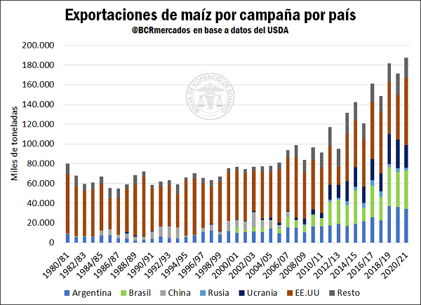 Por otra parte, Argentina y Brasil han aumentado muy significativamente su rol dentro del comercio de este cereal, principalmente el último de estos países. En este sentido, el país carioca pasó de representar menos del 1% del comercio internacional con exportaciones menores al millón de toneladas a principios de la década de 1980 a significar el 20% de las exportaciones mundiales con cerca de 34 Mt en el promedio de las últimas 5 campañas. Por su parte, Argentina ha pasado de exportar cerca de 6 Mt a 31 Mt promedio para el último lustro. Este incremento llevó a nuestro país a representar el 18% de las toneladas comercializadas internacionalmente.