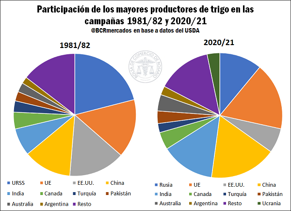 En cuanto al trigo, el USDA estima que la producción mundial ascenderá en esta campaña a las 776 millones de toneladas. Este registro se encuentra un 74% por encima de los registros que se tenían en la campaña de 1981/82. Si bien, el tonelaje representaría un incremento menor al que tuvo el maíz, la producción de este ciclo sería récord histórico para el trigo a nivel mundial. De esta generación, los principales productores son la Unión Europea, China, India, Rusia y EE.UU., mientras que los mayores exportadores del cereal en la campaña 2020/21, según las estimaciones del USDA, en orden de importancia serán: Rusia, la Unión Europea, Canadá, EE.UU. y Australia; a pesar de que hace casi 39 años los mayores exportadores eran EE.UU., Canadá, la Unión Europea, Australia y Argentina.