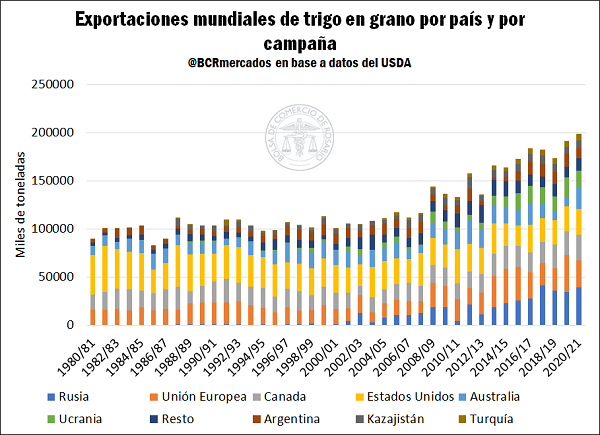La participación dentro de las exportaciones mundiales, nuevamente se vislumbra una merma en la proporción que representa EE.UU., cuando en el comienzo del período suponía el 46% de las exportaciones y a final del mismo se espera que registre el 13% del total comercializado. Por su parte, Rusia, que previamente integraba la URSS, abastece al mercado internacional con el 20% de los granos, cuando en el ciclo 1981/82, apenas representaba el 0,5% del comercio. Asimismo, Ucrania, también país ex URSS, otorgará el 8% del mercado. Por otra parte, la Unión Europea, logró mantener en el tiempo una elevada participación dentro de los exportadores de trigo, con un 16% del volumen hace 39 años, y con un estimado de 14% en la campaña actual. En sintonía con lo sucedido en el mercado del maíz, Argentina logró incrementar en los últimos años la porción del comercio internacional de trigo que representa, pasando del 3,6% al comienzo de la década de 1980, a un 5,8% estimado para este ciclo 2020/21.
