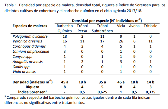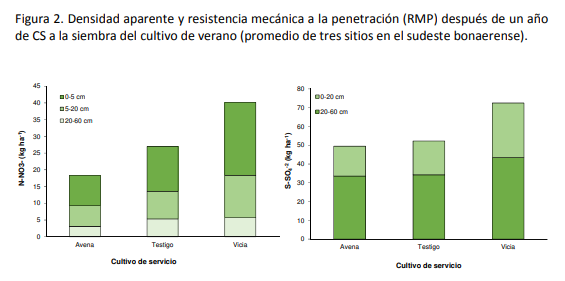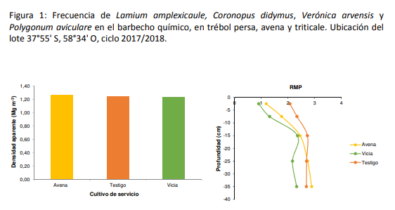 Resultados de dos años de ensayos con cultivos de servicios Según los datos recolectados en los ensayos realizados, se puede indicar que la especie o mezcla a utilizar en la implantación de un CS debería definirse según los beneficios que demande el sistema. Los resultados obtenidos con gramíneas (avena, centeno, triticale) son satisfactorios, ya que se implantaron con facilidad, en una ventana de siembra amplia (otoño e invierno), aportaron gran cantidad de residuos, y su secado o terminación al final del ciclo fue sencilla. Compitieron muy bien con malezas, logrando reducciones de la densidad (número de malezas m -2) y de la riqueza (número de especies). De ser necesario, permiten emplear distintos herbicidas el control de las mismas. Durante el ciclo agrícola 2017/2018 en un lote ubicado en el límite entre Balcarce y Lobería (37°55′ S, 58°34′ O) las experiencias con avena y triticale (CS con herbicidas de presiembra), produjeron reducciones de la densidad de malezas (pl m-2) de 60 % y 69%, respectivamente, al compararlos con el tratamiento de barbecho químico y sin CS a los 163 días después de la siembra (Tabla 1). Asimismo éstos CS lograron reducir la cantidad de especies de malezas respecto del barbecho, modificando también la densidad relativa de cada una de ellas. Pruebas realizadas con siembras aéreas de avena dentro de un cultivo de maíz en pie han mostrado resultados alentadores, ya que el cultivo logró implantarse correctamente y permitió una cobertura de suelo anticipada. Esta estrategia es beneficiosa para la competencia con malezas, debido a que la cobertura temprana del suelo puede impedir o retrasar el nacimiento y/o posterior crecimiento de algunas malezas de ciclo otoño-inverno-primaveral. Se destaca que las gramíneas son una excelente alternativa como antecesor a soja, aunque si se pretende sembrarlos antes de maíz o girasol el quemado debe ser temprano (alrededor de floración) para evitar gran inmovilización de nutrientes en los residuos. Dentro de este esquema de manejo, entre las leguminosas, la vicia es un cultivo interesante por su capacidad de fijar nitrógeno atmosférico. Dado que requiere mayor temperatura que las gramíneas para crecer, es fundamental sembrarla temprano (entre mitad de febrero y mitad de marzo para la zona) a fin de que logre un buen crecimiento otoñal. Durante el 2017 se registró presencia de enfermedades que redujeron la producción de biomasa aérea. En 2018 la severidad del daño por patógenos fue menor, posiblemente asociado a menores lluvias. La consociación de esta especie con gramíneas resultó exitosa, incluso mostrando mejor comportamiento sanitario y mejores rendimientos en biomasa aérea. Se destaca que la disponibilidad de herbicidas para controlar malezas en el cultivo de vicia es acotada, por lo que se debe sembrar en lotes limpios y alcanzar una rápida cobertura del suelo. El logro de una adecuada implantación es determinante para mejorar su capacidad para competir con malezas. Pruebas realizadas con distintos herbicidas y mezclas han mostrado que la terminación o secado del cultivo es sencilla. La inclusión de melilotus y tréboles (subterráneo, rojo y persa) representa un desafío, ya que se ha reportado muy buen comportamiento en otros ambientes, aunque en las evaluaciones realizadas a campo no se ha logrado un buen stand de plantas debido a una emergencia poco uniforme y presencia de plagas. Además, el secado o terminación del cultivo mediante el uso de herbicidas fue más difícil que para otras especies. Respecto al control de malezas, en experiencias locales y en el ciclo agrícola 2017/18 el tratamiento que incluyó trébol persa fue eficiente (comportamiento similar a avena y triticale) en reducir la densidad de las mismas respecto del barbecho químico, mientras que con vicia y trébol subterráneo no se encontraron diferencias con el barbecho químico (Tabla 1). Tal situación reflejó que cuando un CS fue eficiente en competir con las malezas, logró reducir la cantidad de especies presentes, y en consecuencia, su índice de semejanza (cantidad de especies que comparten) con el barbecho fue menor (Tabla 1). Otro efecto positivo observado en los tratamientos que incluyeron CS (avena, triticale y trébol persa) fue la disminución de la frecuencia de aparición de malezas como Polygonum aviculare, Verónica arvensis, Lamium amplexicaule y Coronopus didymus (Figura 1). Las pruebas con nabo, rabanito forrajero y colza despertaron interés por su efecto positivo sobre la estructura del suelo. Sin embargo, no se debe obviar que las principales malezas en el sudeste bonaerense pertenecen a la misma familia botánica, por lo que su inclusión como CS aún es acotada y se encuentra en evaluación. En cuanto al efecto de los CS sobre las propiedades del suelo, se puede afirmar que en el corto plazo no se observaron cambios importantes en variables como: densidad aparente, resistencia mecánica a la penetración y tasa de infiltración (Figura 2). No obstante, es altamente probable que en el largo plazo estas propiedades exhiban mejoras, tal como se ha observado en ensayos de larga duración (más de 6 años) realizados en el campo experimental de la Unidad Integrada Balcarce (INTA Balcarce – FCA, UNMdP). Por otra parte, se determinaron cambios en la disponibilidad de nutrientes, principalmente nitrógeno y azufre. Al momento de la siembra de los cultivos de verano, la cantidad de ambos nutrientes fue mayor cuando el CS fue vicia que cuando fue avena o testigo sin CS (Figura 3). Esto afectó los rendimientos de los cultivos subsiguientes. En tal sentido se determinó que la vicia fue el mejor antecesor para maíz, mientras que la avena mostró reducciones en rendimiento dado que la calidad del residuo produce inmovilización (Figura 4). Para el caso de soja, la avena fue el mejor antecesor, mientras que el antecesor vicia produjo reducciones del rendimiento (Fig.4). Aquí se hipo