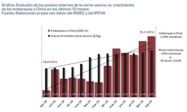 Hasta el momento esta competencia por cortes de consumo no parece ser significativa. Claramente si analizamos la evolución de los precios domésticos contra el volumen que han estado llevando los chinos en los últimos 12 meses, vemos que el ‘efecto China’ sobre el mercado interno aún no resulta visible. El precio promedio de los distintos cortes de carne vacuna muestra un aumento interanual cercano al 45%, más de 8 puntos porcentuales por debajo de la tasa de inflación acumulada (53,8%).