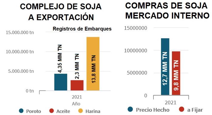 - Complejo sojero: durante todo el 2020 se exportaron en total 6,8 millones de toneladas de grano de soja, 23,1 millones de toneladas de harina de soja y 5,4 millones de toneladas de aceite de soja. En los gráficos vemos, a la izquierda, el volumen de registros de embarques que representa compromisos de embarques que deben cumplirse o ya se cumplieron. A la derecha se observan las compras de grano de soja del mercado interno, con precio y a fijar.