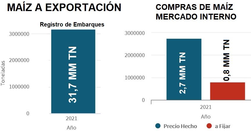 - Maíz: durante el 2020 se ha exportado un total de 37 millones de toneladas de maíz como granos. Hasta junio 2021 se registraron en total 17,5 millones de toneladas de grano de maíz exportada, sumando saldo 19/20 y maíz nuevo 20/21. El volumen de maíz 20/21 comprometido para embarcar, alcanza hasta ahora 31,7 millones de toneladas. Es decir que si bien estamos muy cerca del volumen de grano exportado el año pasado, según los compromisos ya asumidos, ya que nos falta poco más de 5 millones de toneladas, para llegar a 37 millones, aún restan más de 19 millones de toneladas.