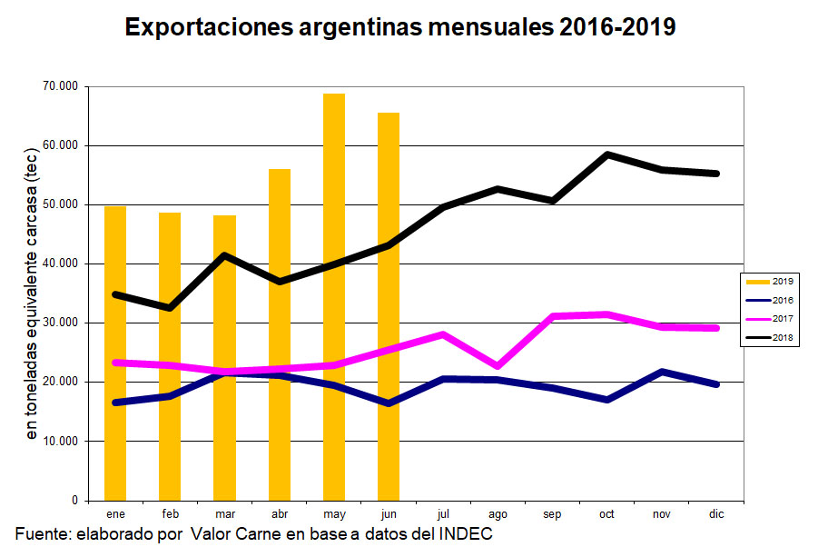En junio, las exportaciones argentinas totalizaron 66 mil toneladas equivalente carcasa (tec), 5% menos que en mayo pero 52% más que hace un año.