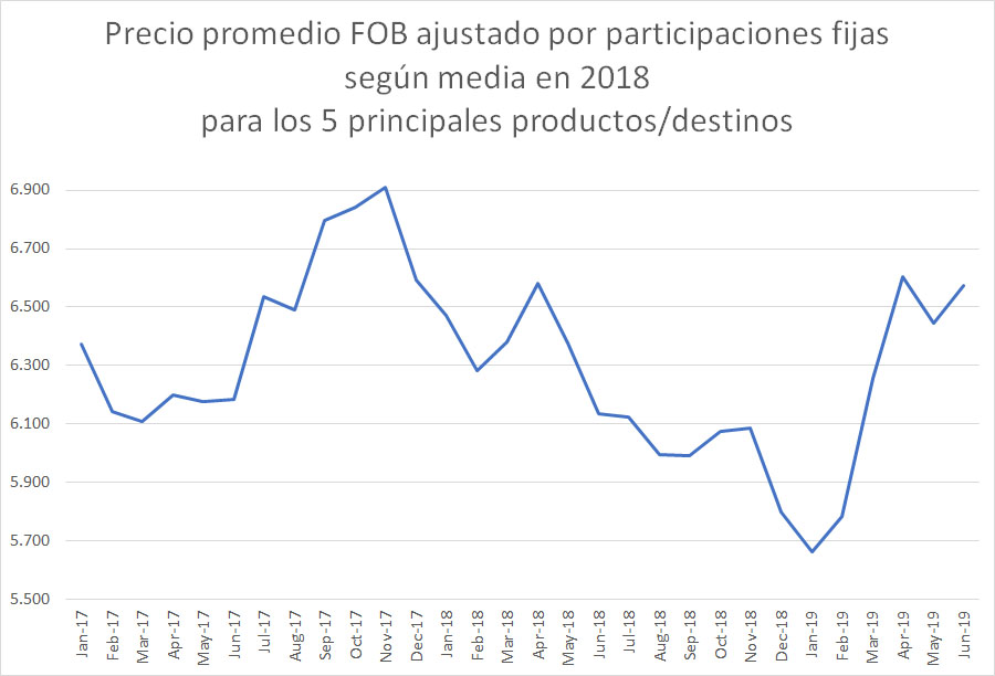 Si se ajusta el precio promedio a participaciones fijas de los mercados de destino, el valor de junio aumentó 5% con respecto a mayo, 20% versus el piso reciente de enero último y 11% en forma interanual. A su vez, quedó sólo 2% por debajo del pico más reciente de noviembre de 2017, como se aprecia en el gráfico.