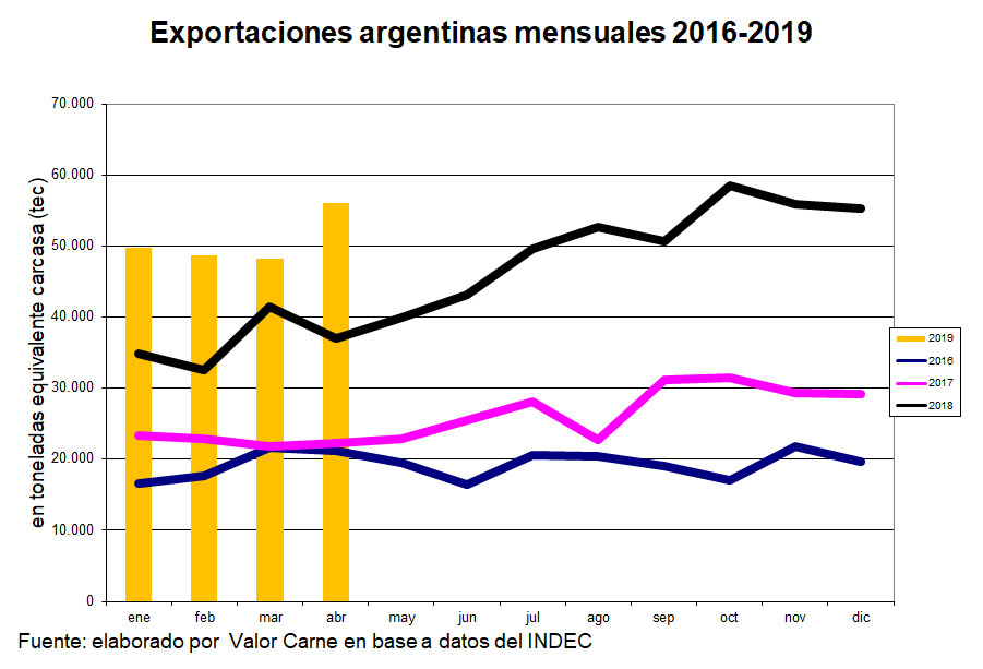Las exportaciones argentinas totalizaron 56 mil toneladas equivalente carcasa (tec) en abril, 16% más que en marzo y 51% más que en el año anterior.