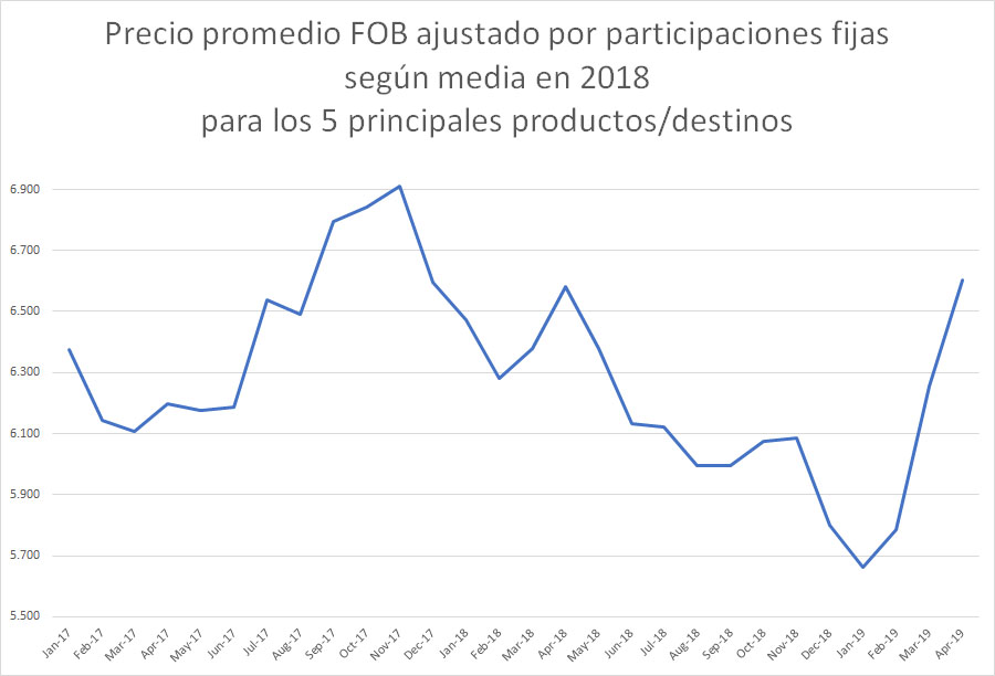 El valor promedio FOB de abril fue de casi USD 5.200 por tonelada, marcando bajas de 6% con respecto al mes pasado y del 7% en relación a abril de 2018.