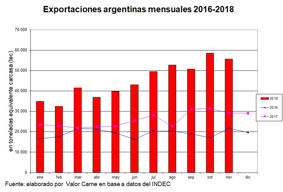 En noviembre, las exportaciones argentinas alcanzaron 56 mil toneladas equivalente carcasa (tec), 5% menos que en octubre y 90% más que hace un año.