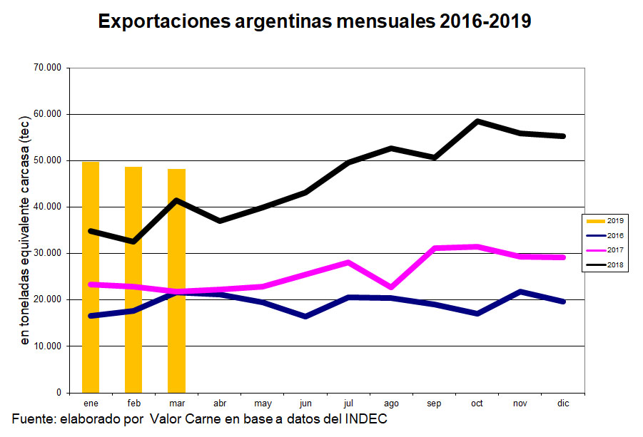 Las exportaciones argentinas totalizaron 48 mil toneladas equivalente carcasa (tec) en marzo, muy similares a las de enero y febrero.
