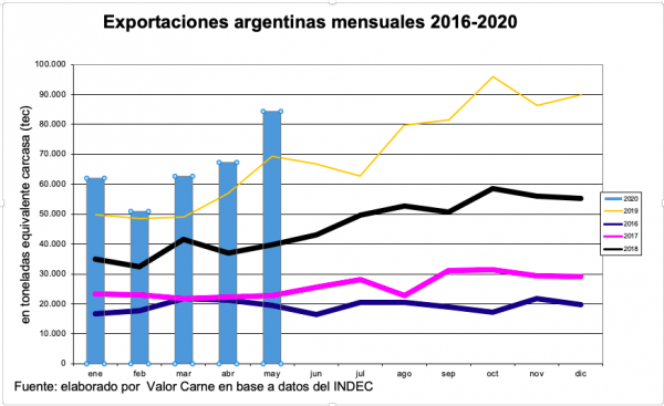 Las exportaciones argentinas totalizaron 84 mil toneladas equivalente carcasa (tec) en mayo, 25% más que en abril y casi la misma diferencia con respecto a mayo de 2019.
