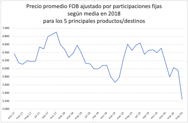 El precio promedio FOB fue de USD 4.300 por tonelada, el menor en muchos años, con bajas del 3% en relación a abril y del 18% interanual.