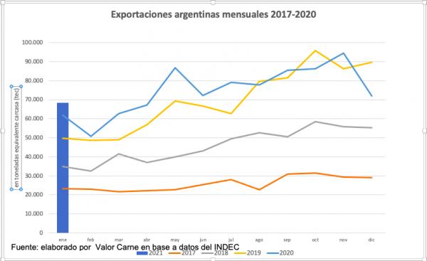 Las exportaciones argentinas totalizaron 69 mil toneladas equivalente carcasa (tec) en enero, 5% menos que en diciembre y 10% más que hace un año, cuando comenzó a manifestarse la crisis comercial en China pero aún en un escenario global prepandemia.