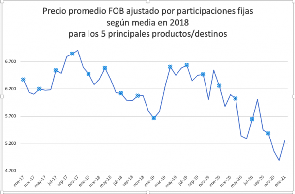 El precio promedio FOB por tonelada peso embarque fue de USD4.100, 2% más que en diciembre pero un sustancial 23% menos en un año.