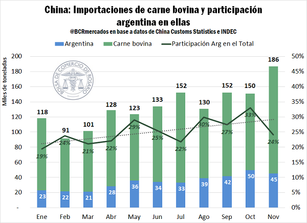 Siguiendo los datos de importación de la Aduana de China, en el mes de octubre el gigante asiático importó 150.000 toneladas de carne y despojos vacunos. A su vez, las exportaciones argentinas de estos productos a China en el mismo mes ascienden a 50.000 toneladas, según datos del INDEC. Con esto, un tercio de los cortes y despojos vacunos que importó China en octubre fueron producidos en Argentina. El décimo mes del año mostró uno de los volúmenes mensuales de importación de carne vacuna más altos de 2019 para el gigante asiático. Así como también los despachos de carne argentina a China alcanzaron un máximo mensual dicho mes.