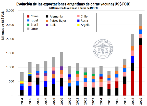 La demanda china impulsó el despegue de las exportaciones de carne bovina en 2019. China, que en 2018 recibía el 56% de las ventas argentinas de esta carne, en 2019 comrpró el 74% de la carne bovina nacional. La mayor participación del gigante asiático en los despachos nacionales está directamente relacionada con el impacto de la Peste Porcina Africana sobre la producción y el consumo de carne de cerdo y con el cambio en los hábitos de consumo en China. Respecto del crecimiento de la participación de China, ROSGAN (2020) apunta que es “crucial el hecho de que Argentina –sin desaprovechar la enorme oportunidad que sigue representando China aún en este contexto- no deje de sostener e incluso desarrollar otros mercados alternativos que permitan mantener el nivel de actividad conseguido por la industria exportadora, aunque con una mayor independencia del devenir chino”.
