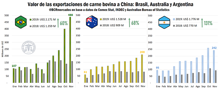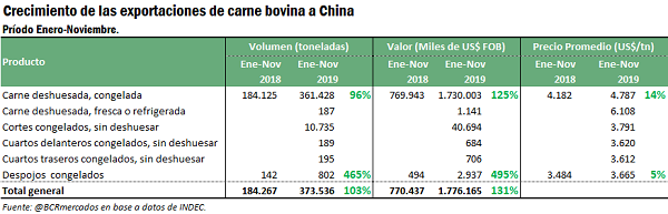 En el período Enero-Noviembre de 2018 Argentina exportó US$ 770 millones a China, mientras que en igual período de 2019 el valor exportado ascendió a US$ 1.776 millones. De esta manera, el valor FOB de las exportaciones bovinas de Argentina al gigante asiático en 2019 más que duplicaron lo despachado en 2018.