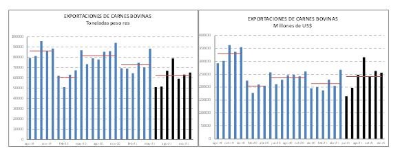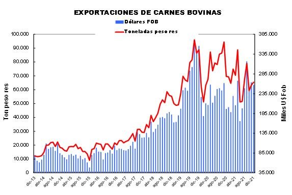 Es importante resaltar que en el curso del año recientemente finalizado, las exportaciones de carnes congeladas con hueso fueron el rubro más dinámico, al punto que en los primeros meses en que no se aplicaron medidas restrictivas, compensaron la disminución en el tonelaje de las carnes congeladas desosadas.