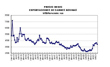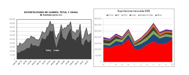 En los últimos meses de 2021, la mayor participación de los contingentes arancelarios, la caída relativa de China dentro del total y el incremento en las cotizaciones internacionales – por la particular situación que se atravesó en el mercado de carnes bovinas, ante el cierre a las carnes brasileñas impuesto por China desde principios del mes de septiembre que se mantuvo hasta mediados de noviembre último – han reducido el impacto de las restricciones aplicadas sobre el volumen exportable. El tonelaje promedio disminuyó 15 % y un 25 % comparando con la media de los primeros meses del año en curso y de la segunda mitad de 2020, respectivamente, pero tuvo una mejora de más del 30 % en el precio medio respecto de iguales lapsos.