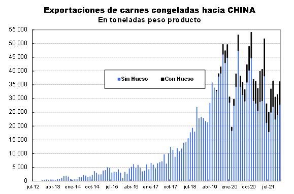 China representó el 95 % del volumen total de carnes congeladas y, prácticamente, la totalidad del rubro que contiene productos congelados con hueso, cuyo volumen fue el más elevado desde que se habilitó la posibilidad de certificar estos productos.