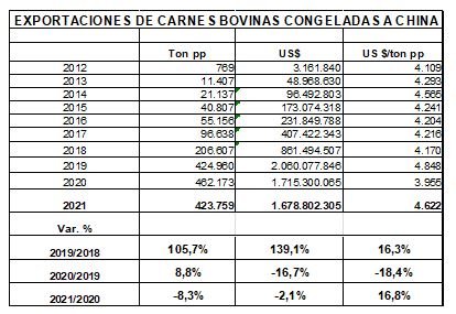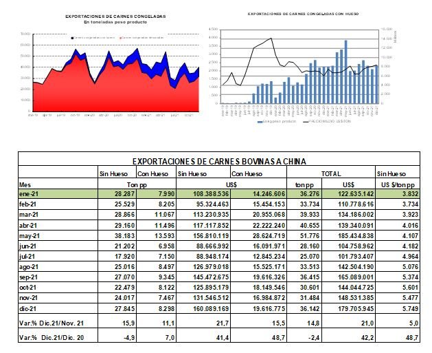 Al cierre del año pasado, las carnes congeladas con hueso sumaron 109 mil toneladas, que han facturado casi 223 millones de dólares, 71 % más que en 2020, con una caída del 3 % en el valor medio – 2000 US$/tonelada pp – consecuencia en buena medida de su concentración en huesos con carne.