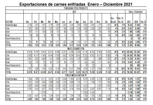 Es resaltable el incremento de las carnes enfriadas, respecto de 2020: fueron la tercera parte del volumen total, este hecho y el aumento en los valores medios han favorecido el aumento de la facturación que sumó 122.5 millones de dólares, a un valor medio de casi 6200 US$/tonelada, un 30 % por encima del año pasado.