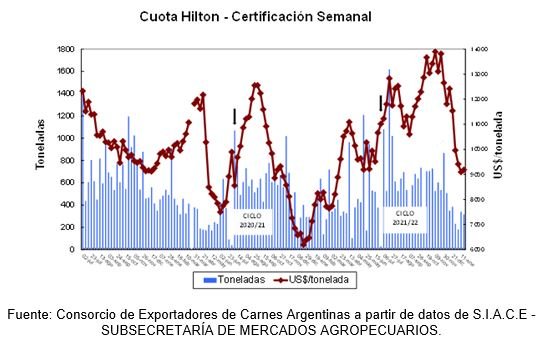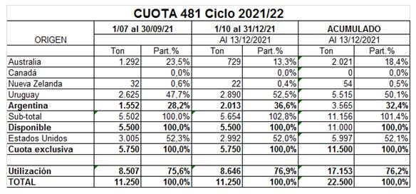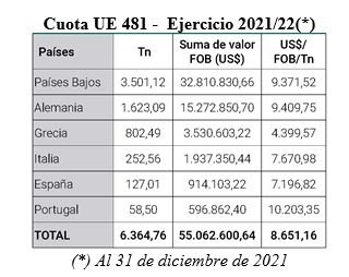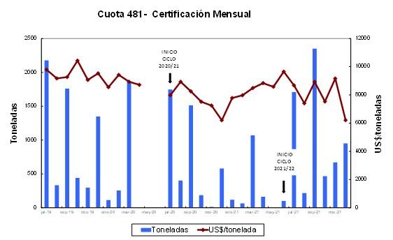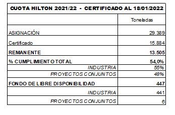 Al 18 de enero de 2022, se han certificado 15884 toneladas sobre un total que se ha reducido a 29.389 toneladas, dado que como resultado del BREXIT se derivaron 111 toneladas al Reino Unido. Después del pico registrado en noviembre, en el que se concentraron las ventas para las fiestas de fin de año, se observó una disminución en el ritmo de certificación, que llegó al 54 % del contingente total. El Fondo de Libre Disponibilidad ya fue utilizado en 382 toneladas, con la reciente renuncia de 206 toneladas, se elevó a 447 toneladas a esa fecha.