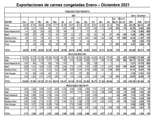 En diciembre, los embarques de carnes congeladas hacia China sumaron 36 mil toneladas peso producto, 8.3 mil toneladas fueron productos con hueso, un volumen que fue 20 % menor a la media de los primeros cinco meses de 2021.