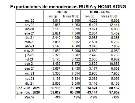 Rusia y Hong Kong tienen una incidencia pequeña que se eleva al 3 % cuando se suman las menudencias al valor total exportado.