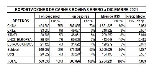 China mantuvo su claro liderazgo en el ranking de los principales destinos de las exportaciones argentinas de carnes bovinas: se exportó el equivalente a 588 mil toneladas peso res (incluyen una porción de carnes enfriadas), es decir el 73 % del total. En términos de valor participó con el 60 % del total. Le siguió Unión Europea (15%), seguida por Israel y Chile. Es remarcable, la ponderación que alcanzó Estados Unidos, concentrando el 5 % del total facturado en concepto de carnes bovinas.