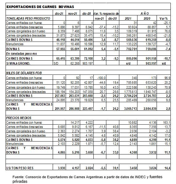 “En 2021, las exportaciones de carnes bovinas sumaron 805 mil toneladas peso res, 11 % menores a 2020, aunque similar en valor: fueron 2724 millones de dólares y llegaron a 2784 millones de dólares en 2021 -. Con las menudencias de origen bovino, el total facturado alcanzó 3070 millones de dólares, 85 millones por encima más que en el año precedente, pero 325 millones por debajo de 2019, que se mantuvo como el récord histórico en facturación de las exportaciones argentinas de carnes bovinas”, concluyó Ravettino.