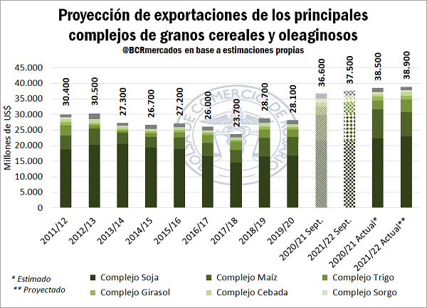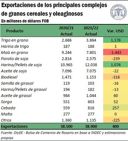Procediendo de igual manera para cada uno de los productos bajo análisis, las actuales estimaciones desprenden que los principales complejos del sector agroindustrial podrían alcanzar despachos por US$ 38.900 millones en la 2021/22, pudiendo llegar a superar en US 400 millones el registro de la 2020/21.