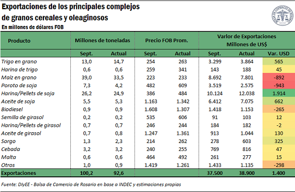 En primer lugar se destacan los derivados de soja: harina/pellets y aceite. Entre lo que se esperaba en septiembre y lo que se proyecta actualmente, la harina de soja incrementaría su valor de exportaciones en la campaña en US$ 1.900 millones y alcanzaría despachos por más de US$ 12.000 millones. En el caso del aceite, la estimación del valor de las exportaciones se incrementaría en más de US$ 660 millones, alcanzando actualmente una proyección de casi US$ 7.100 millones. Reiteramos una vez más: todo a confirmar si se mantienen los precios internacionales y si no hay mayores recortes productivos.