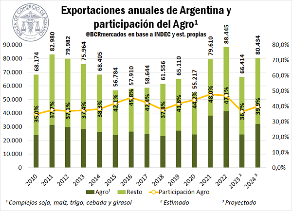 Por la sequía, el ingreso de dólares del agro cayó un 53% interanual en 2023 a su valor más bajo desde 2010, aunque se prevé una recuperación de cara a 2024. Junto con ello, se proyecta recuperación de la participación del agro en las exportaciones totales