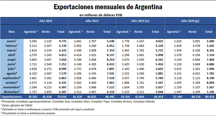 Finalmente, en el cuadro que sigue se muestran las exportaciones totales mensuales estimadas para 2023 y proyectadas para 2024. Se puede apreciar que las exportaciones agroindustriales se mantendrían considerablemente por debajo de los años anteriores para los meses que restan del año y el primer trimestre del año próximo. No obstante, se prevé que a partir del segundo trimestre del 2024, a medida que comienza a ingresar la nueva cosecha, se recupere el valor de las exportaciones del sector.