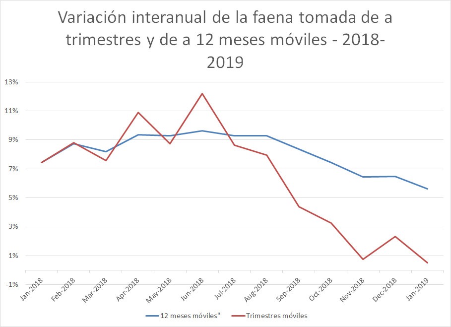 Otra variable, a la que prestamos más atención, es la trayectoria de las variaciones interanuales en la faena total, tomadas de a 3 y de a 12 meses móviles.