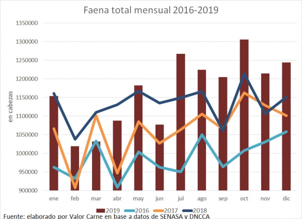 La faena de diciembre alcanzó a 1,24 millones de animales, 2% más que en noviembre y 8% más que hace un año. Pero si se considera el procesamiento promedio diario, las comparaciones arrojan -2 y +3% respectivamente.