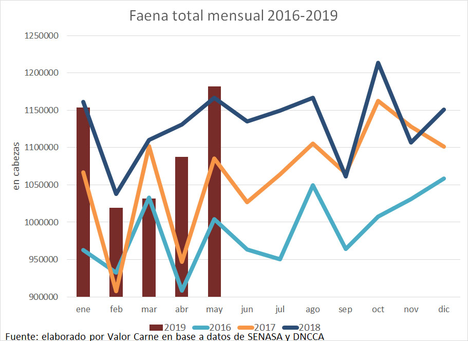 En mayo se faenaron 1,18 millones de cabezas, 9% más que en abril y 1% más que hace un año.