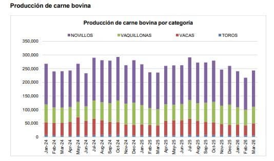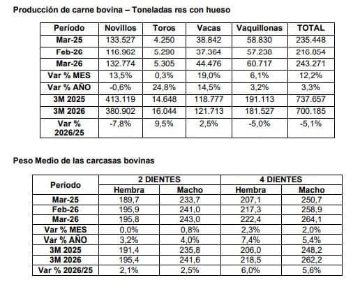 La producción de carne bovina del mes de marzo de 2026 alcanzó las 243,3 mil toneladas res con hueso, incrementándose en cerca de 26,4 mil toneladas con respecto al mes anterior, y también creciendo en 7,8 mil toneladas con respecto al mes de marzo del año 2025. En los primeros tres meses del año 2025, la producción de carne bovina alcanzó las 700,2 mil toneladas equivalente res con hueso; situándose 37,5 mil toneladas por debajo del acumulado del período enero a marzo de 2025, que había ascendido a 737,7 mil toneladas equivalente res con hueso.