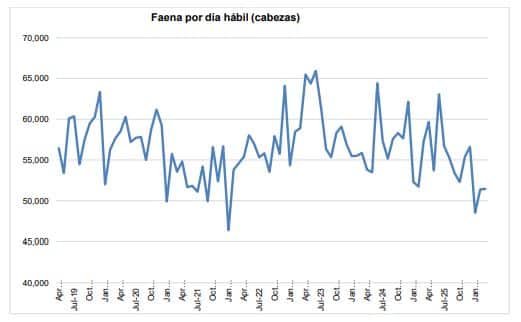 La faena diaria del mes de marzo del corriente año, se ubicó en 51,5 mil cabezas, un (+0,1%) por encima de las 51,4 mil diarias procesadas en febrero, y un (-10,8%) por debajo de las 57,3 mil correspondientes a marzo de 2025.