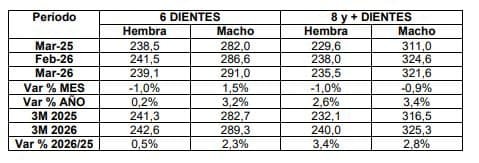 mes de febrero; y un alza de un (+3,3%) con respecto al mes de marzo del año 2025. En los primeros tres meses del año 2026, se produjeron aproximadamente 700,2 mil toneladas equivalente carcasa; un (-5,1%) menos que las 737,7 mil toneladas obtenidas entre enero y marzo de 2025”, sostuvo Mario Ravettino, presidente del Consorcio ABC.