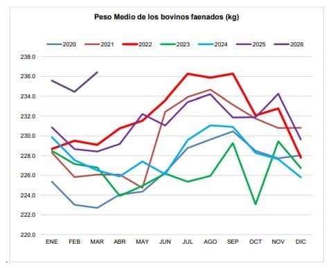 alcanzó los 236,4 kilogramos, siendo un (+0,8%) superior a los 234,4 kilogramos del último mes de febrero; y resultando moderadamente superior, (+3,5%), a los 228,4 kilos de marzo de 2025.