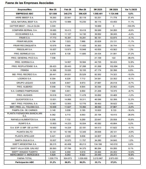 ABC, alcanzó las 396,4 mil cabezas en el último mes de marzo, representando el 38,5% de la faena total. La participación del ABC en la faena total crece con respecto al 36,8% alcanzado en febrero de 2026; y también es superior al 31,2% alcanzado en marzo de 2025. Entre enero y marzo de 2026, las empresas asociadas al Consorcio ABC faenaron 1,124 millones de bovinos, representando un 37,8% de la faena total”, concluyó Ravettino.