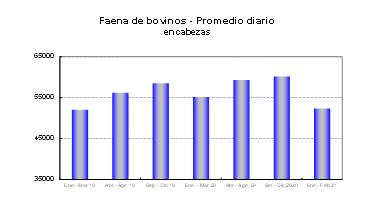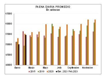 La evolución de la faena diaria indica una recuperación en el nivel de actividad al compararla con enero, si bien debemos remontarnos a marzo del año pasado para encontrar un nivel inferior de faena diaria. Al considerar el primer bimestre de 2021, se observa que el promedio diario es un 10% menor al correspondiente a los últimos meses de 2020.