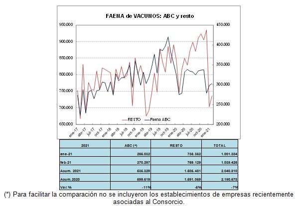 Buenos Aires, 05 de marzo de 2021 – De acuerdo a datos proporcionados por la Dirección Nacional de Control Comercial Agropecuario (DNCCA), en febrero de 2021 la faena de bovinos alcanzó 1,039 millones de cabezas, un 3,8% superior a la del mes precedente – en la que observó una importante caída- , y ligeramente superior a la de doce meses atrás. En los dos primeros meses del corriente año, se han sacrificado 2.04 millones de bovinos, 7% menos que en igual lapso de 2020 y la menor cifra desde 2017.
